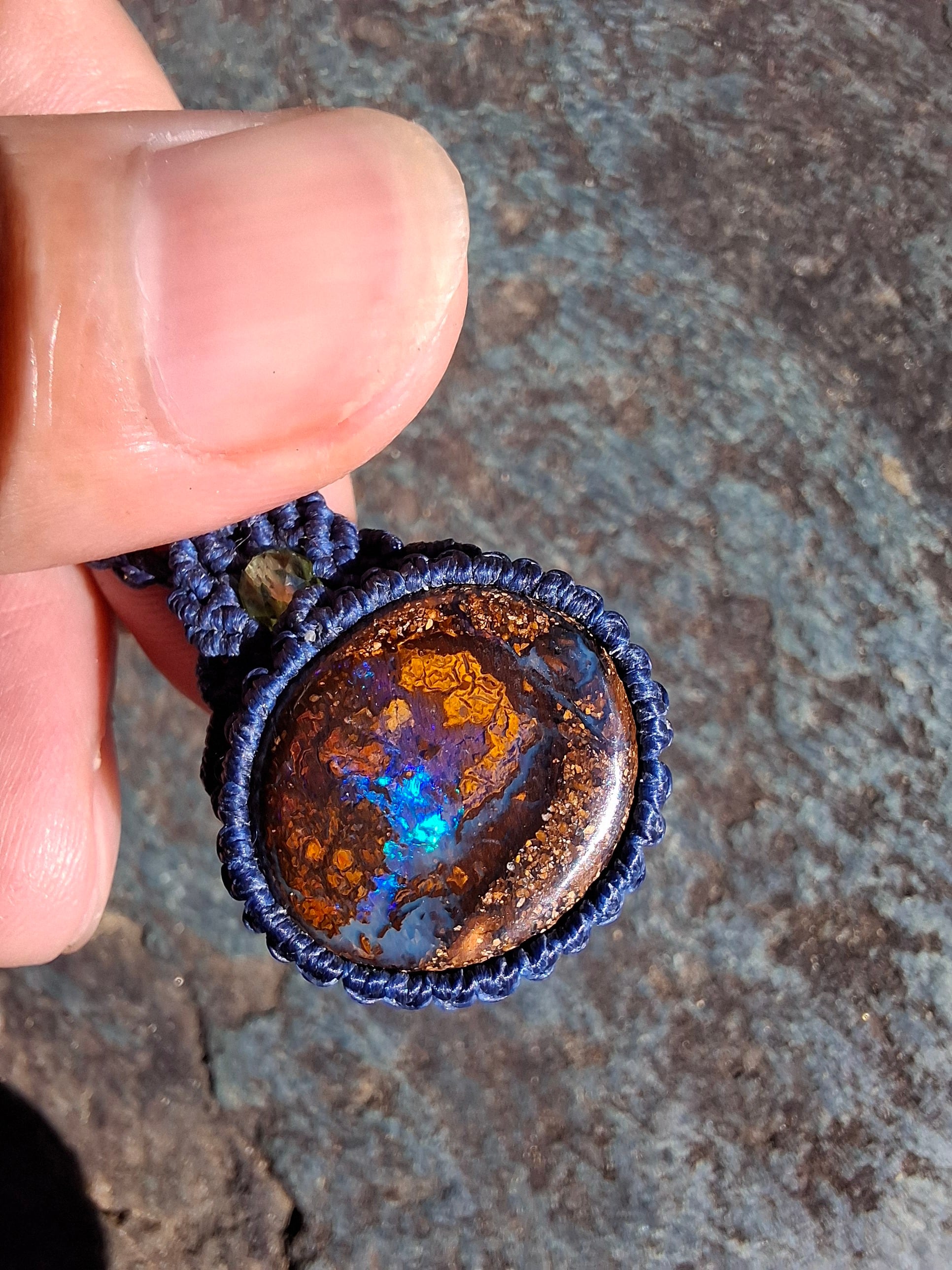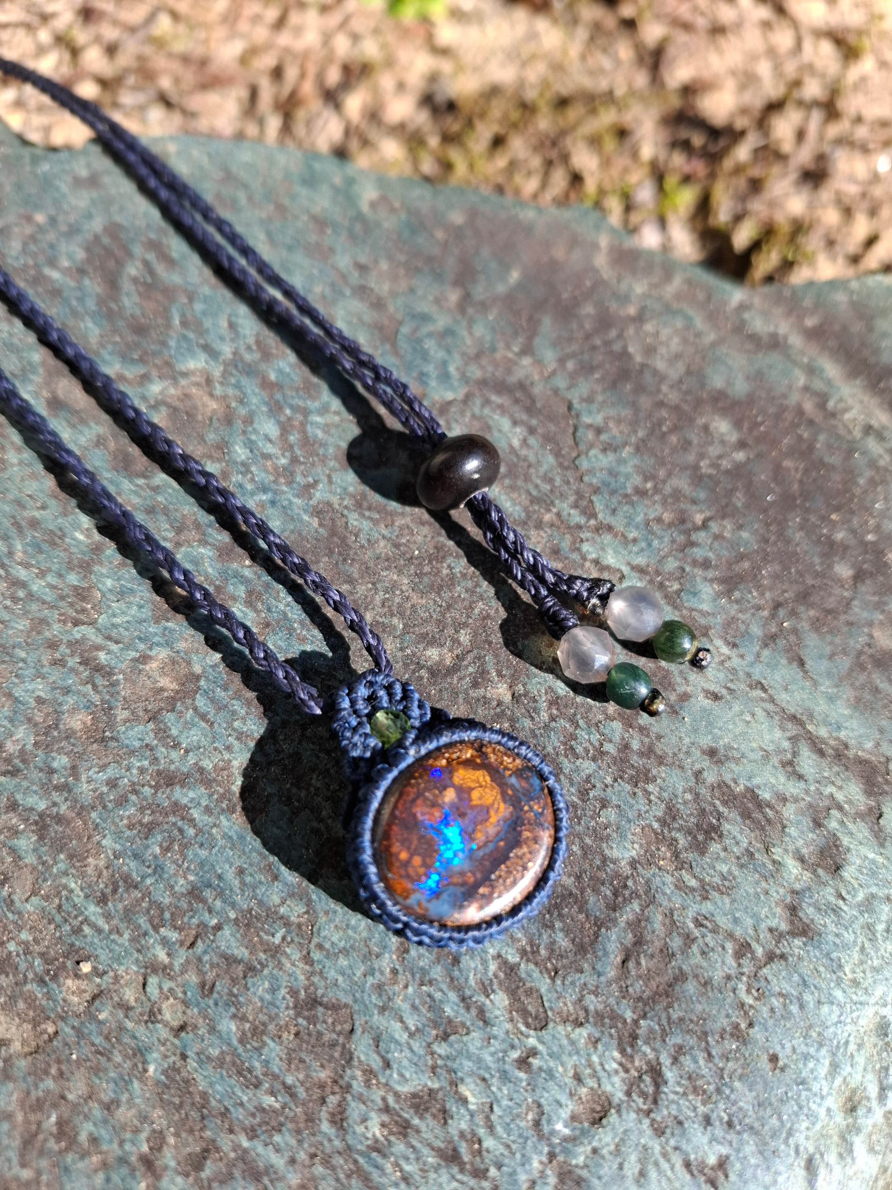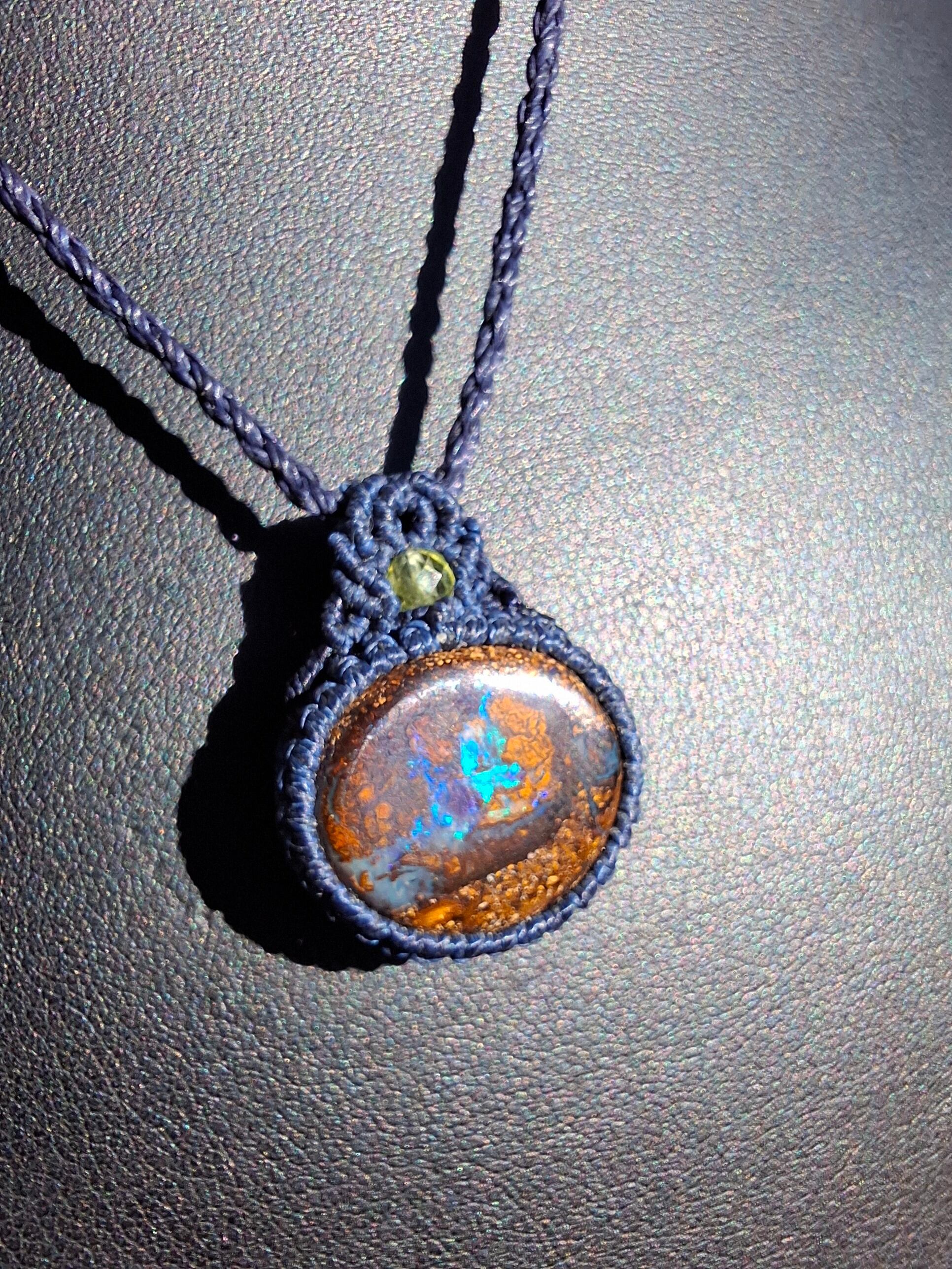 オーストラリア産のボルダーオパールで作ったマクラメ編みのペンダントです。