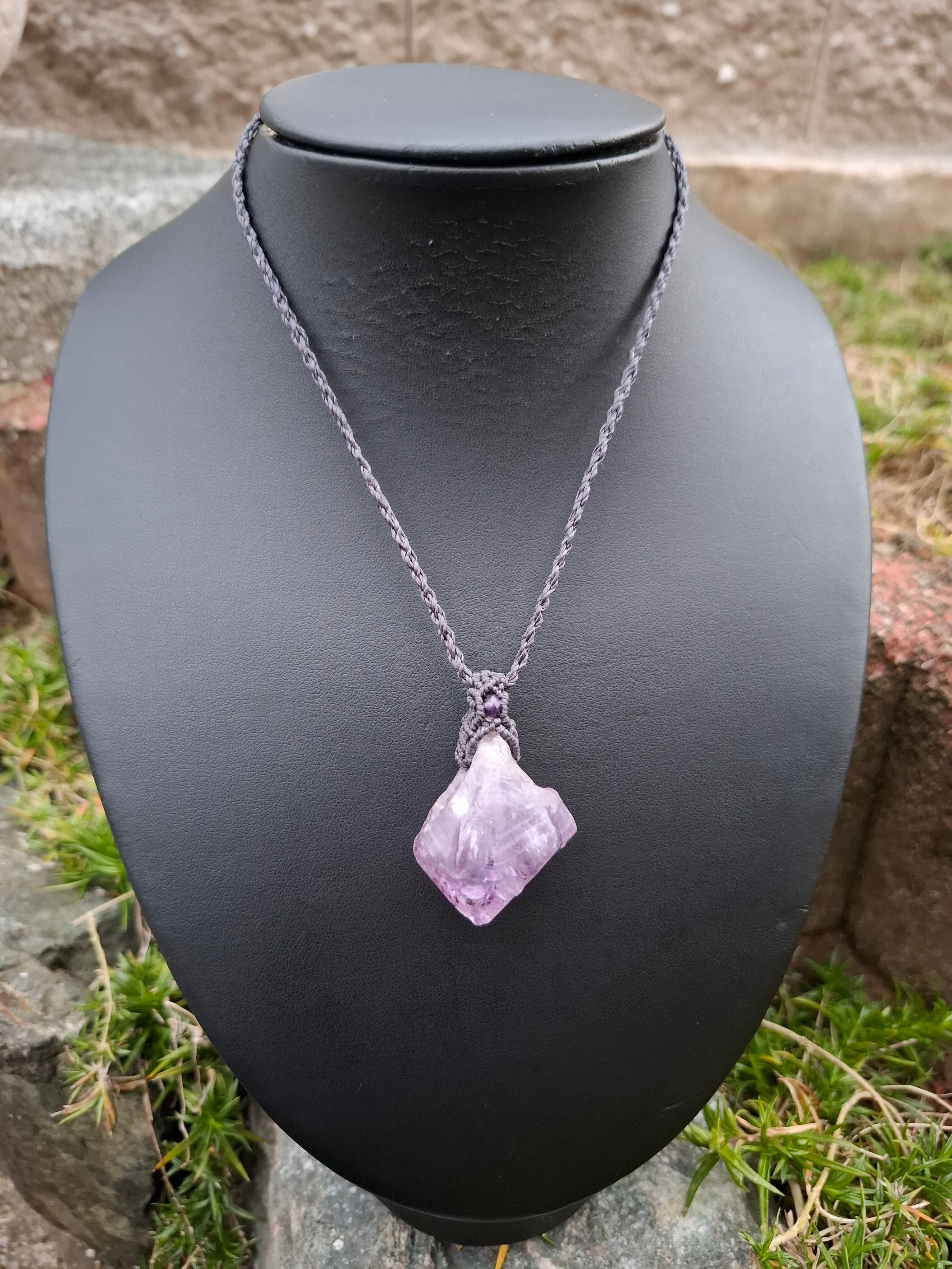 ゲーサイト入りアメジストで作ったマクラメ編みのペンダントです。