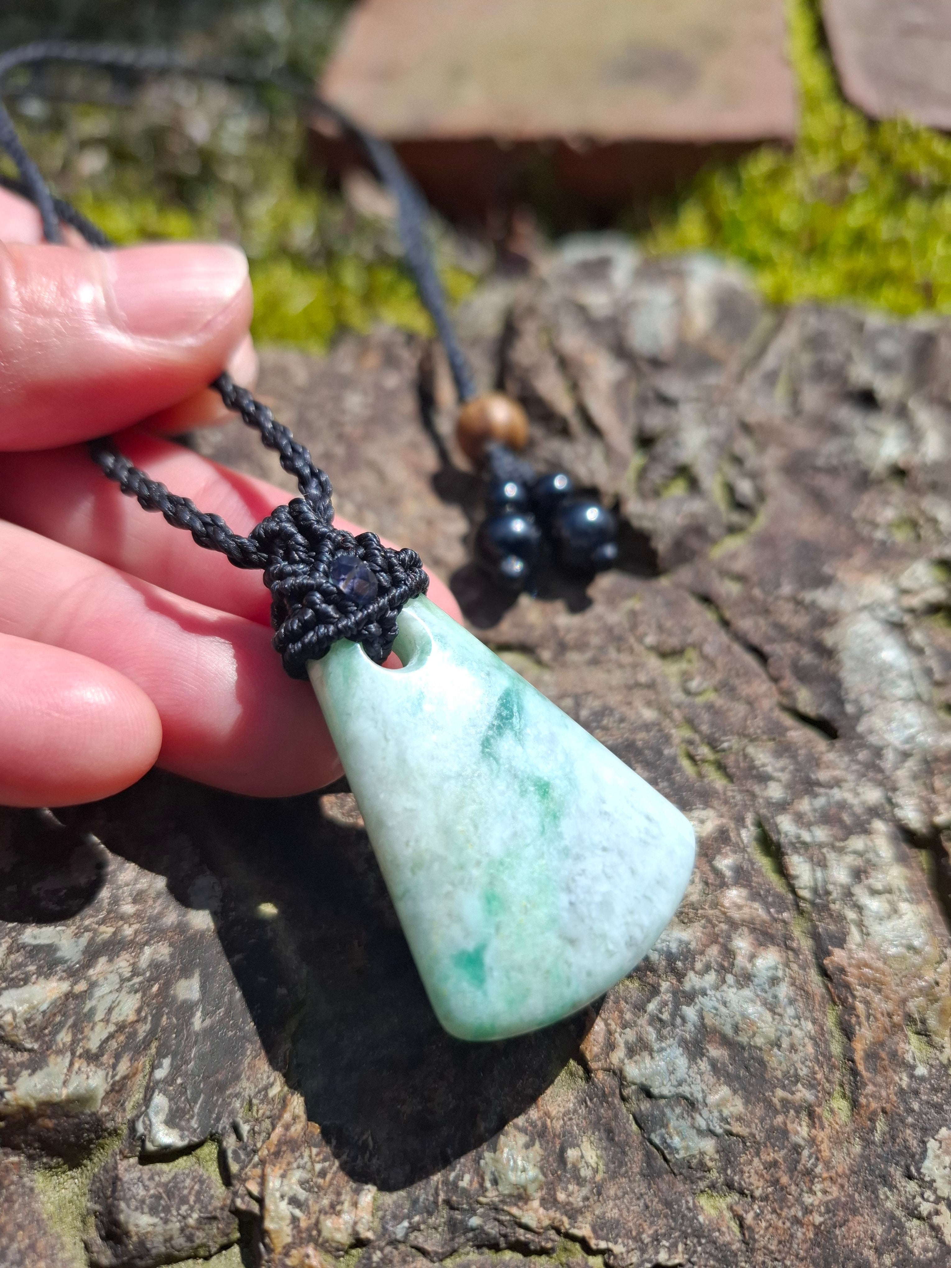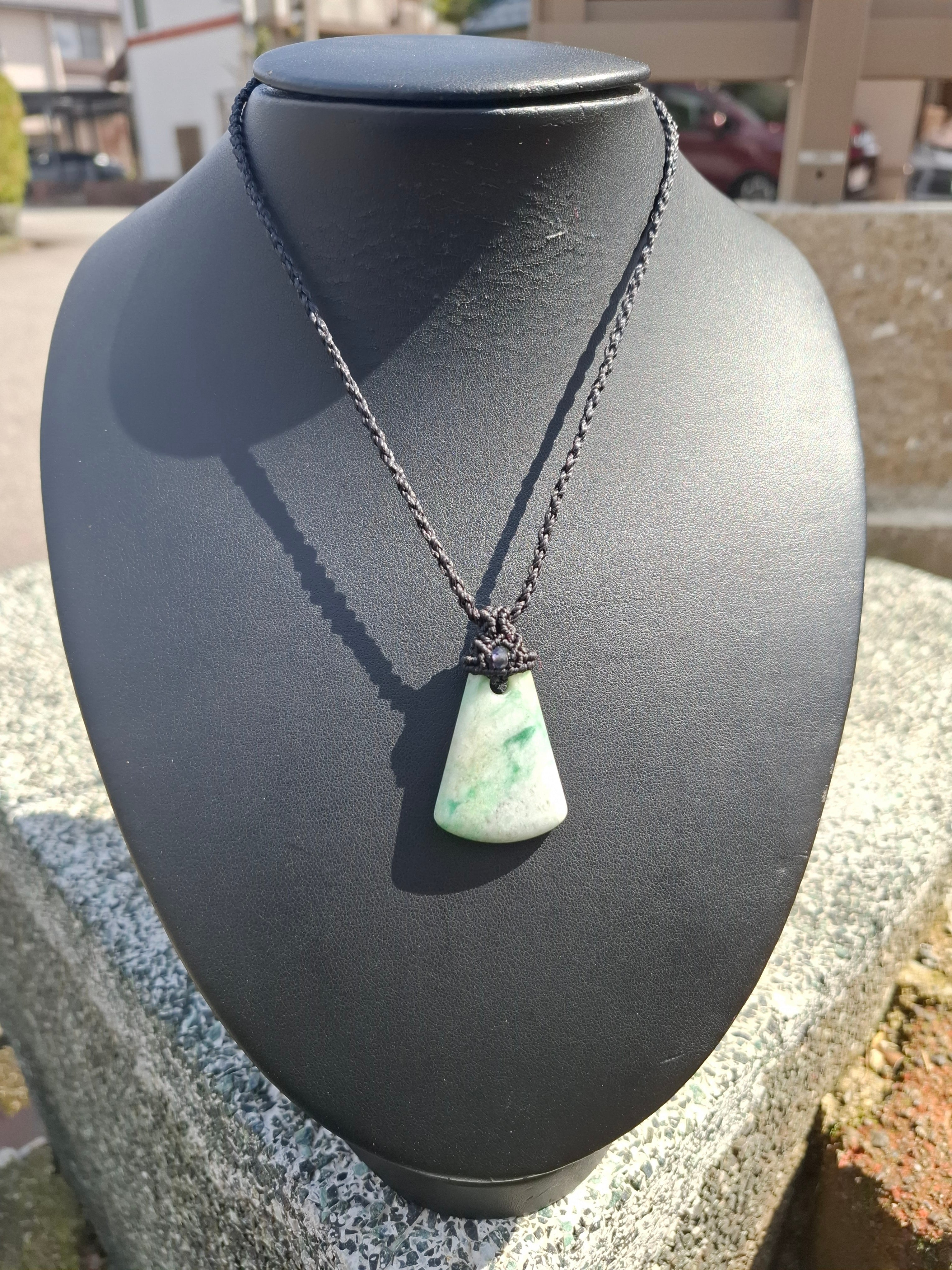 糸魚川からやってきた翡翠で作ったマクラメ編みペンダントです。
