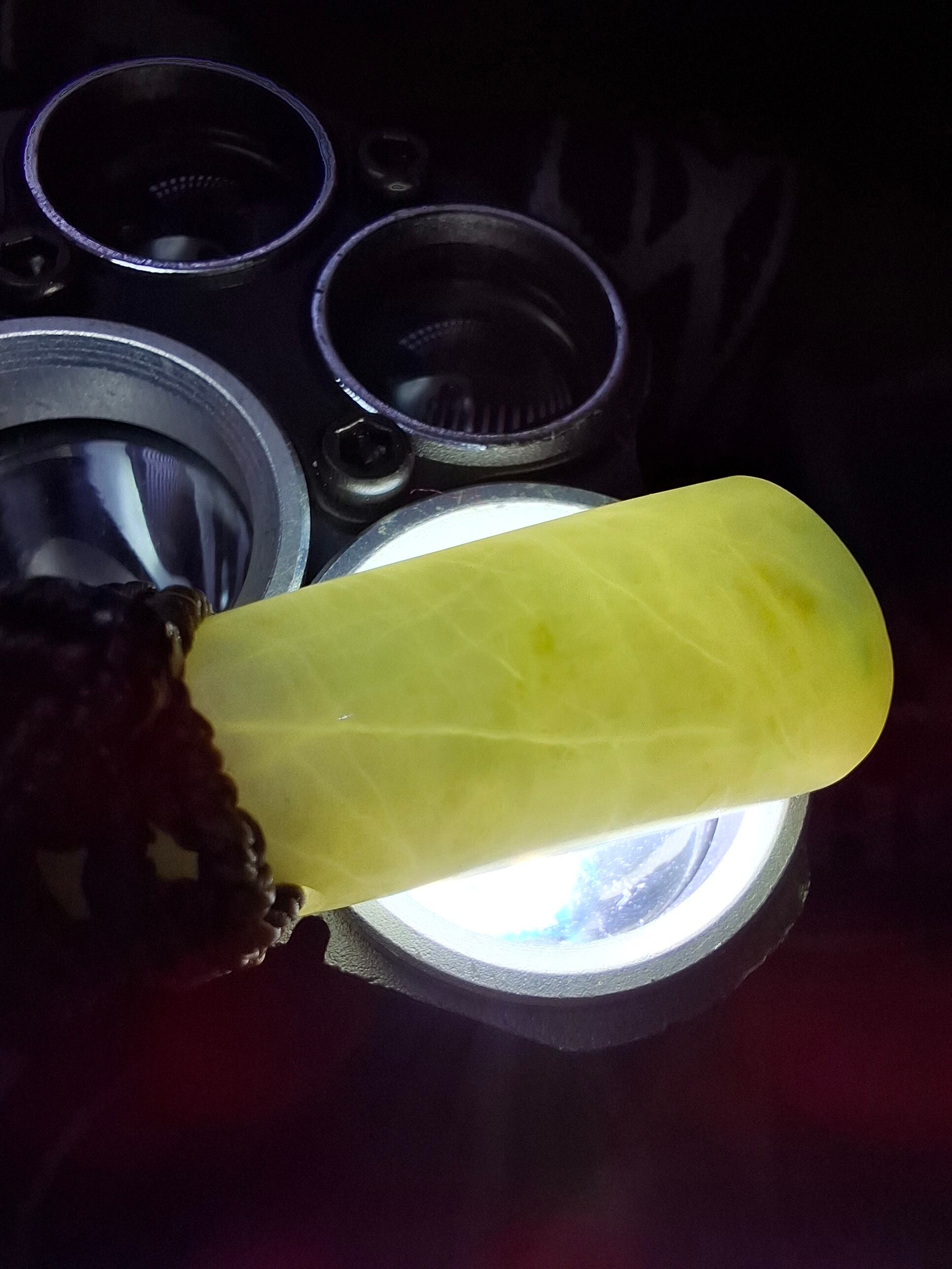 糸魚川在住翡翠職人「神玉工房」さまが削りだした子です。明るく淡い黄緑色のボディをしています。背面先端部には翡翠らしい緑色がちらちらとおります。つるつる艶やか、透過性があります。