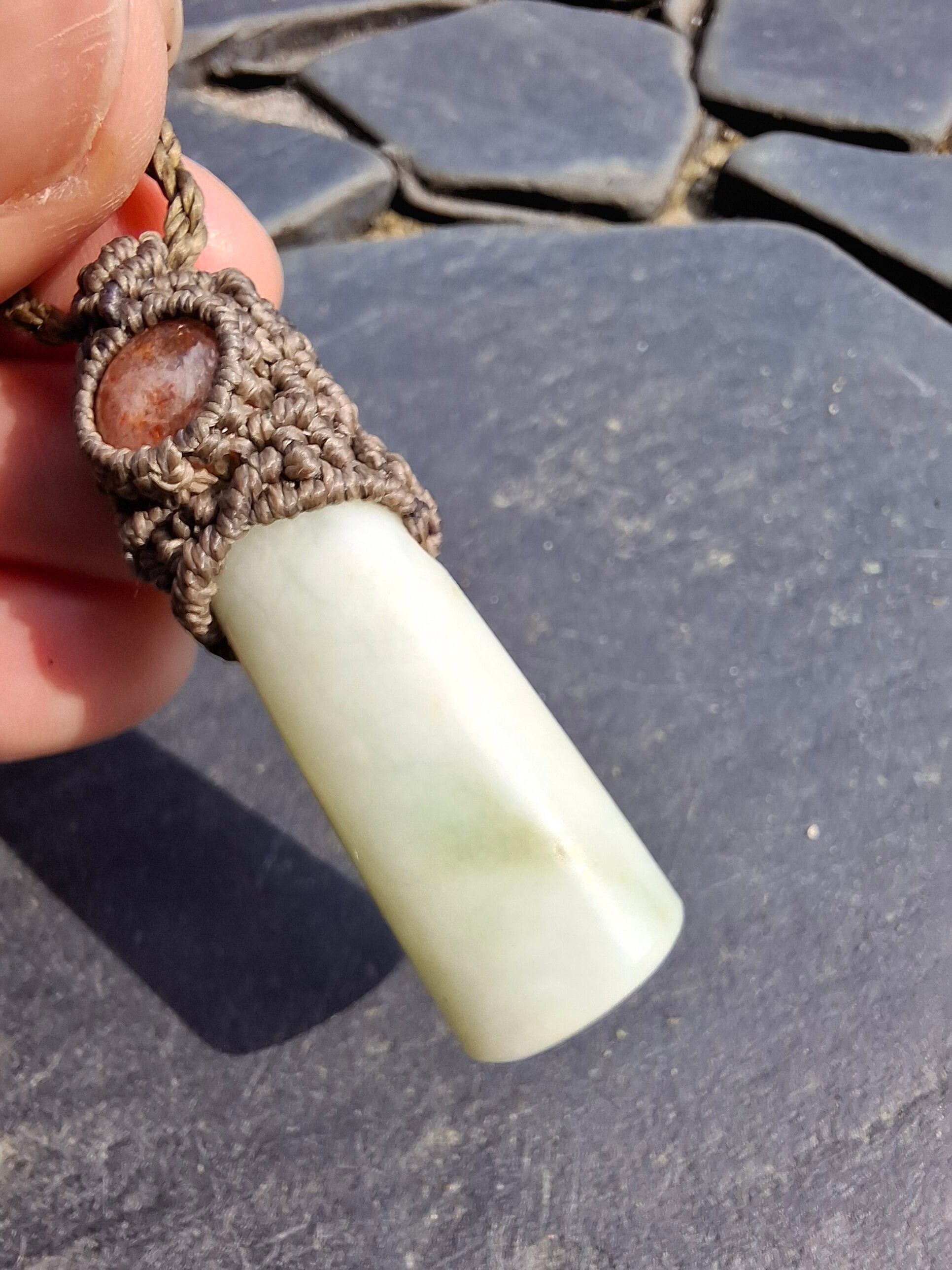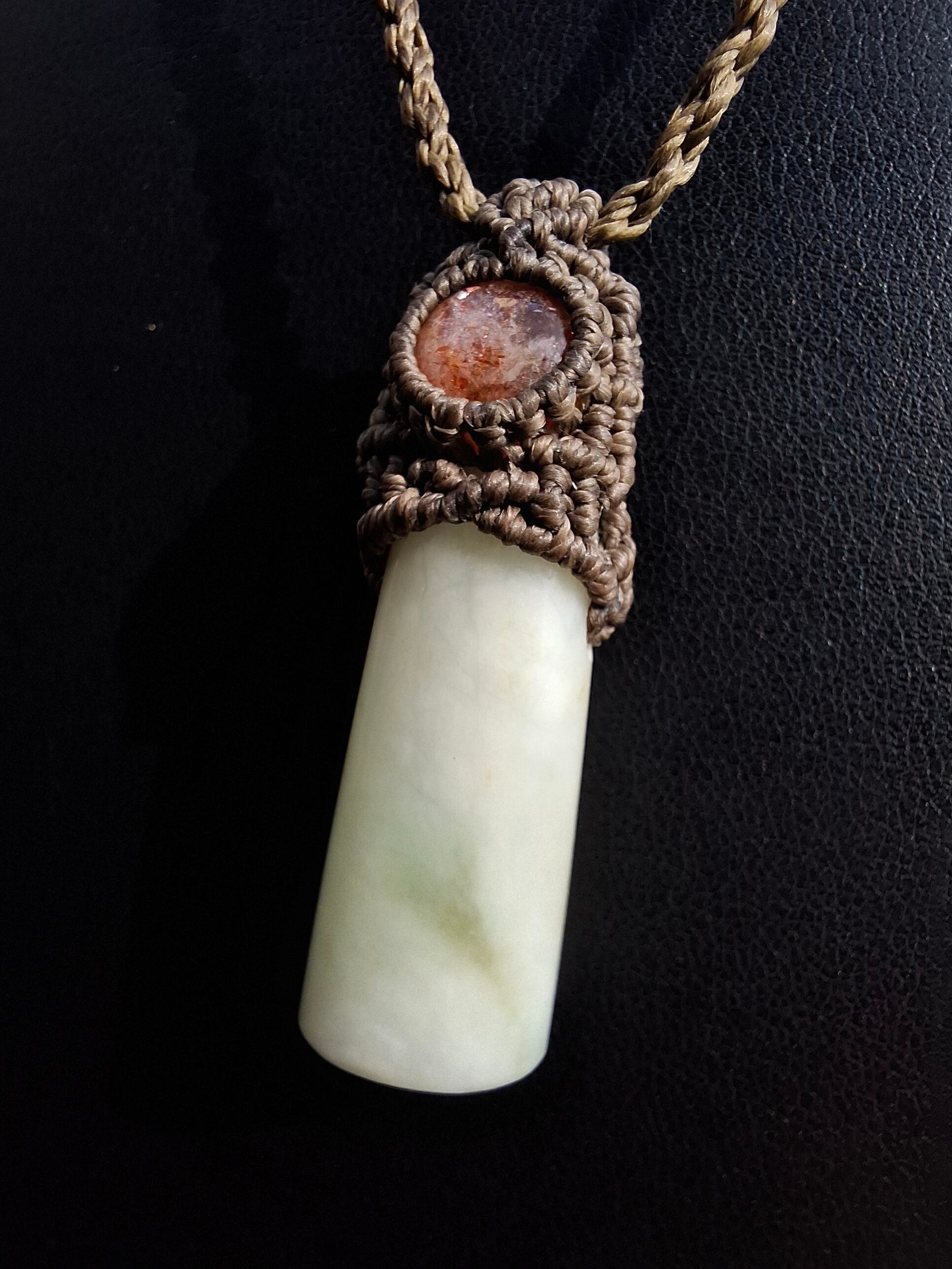 糸魚川からやってきた翡翠とサンストーンで作ったマクラメ編みペンダントです。