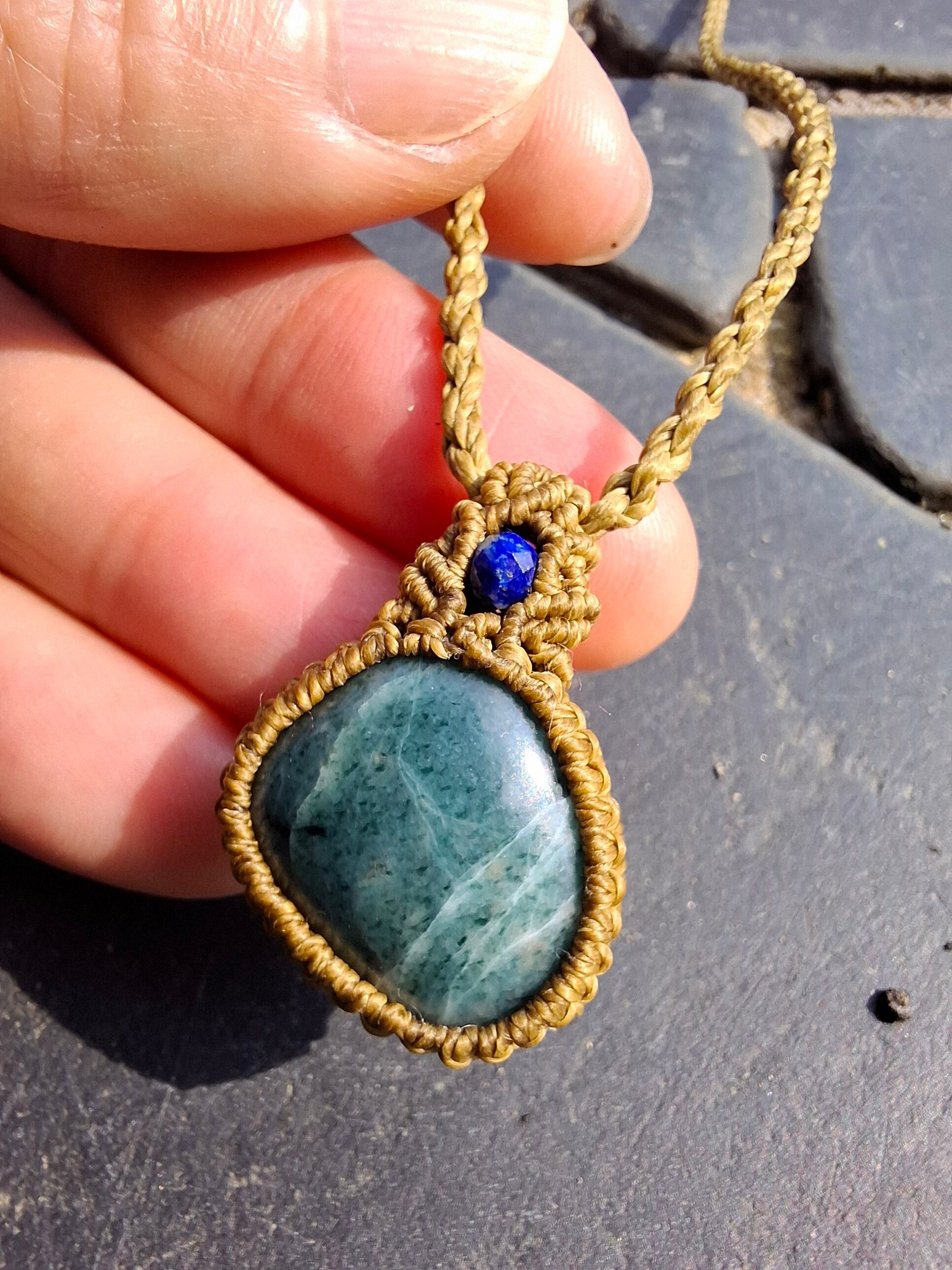 糸魚川からやってきた翡翠で作ったマクラメ編みペンダントです。