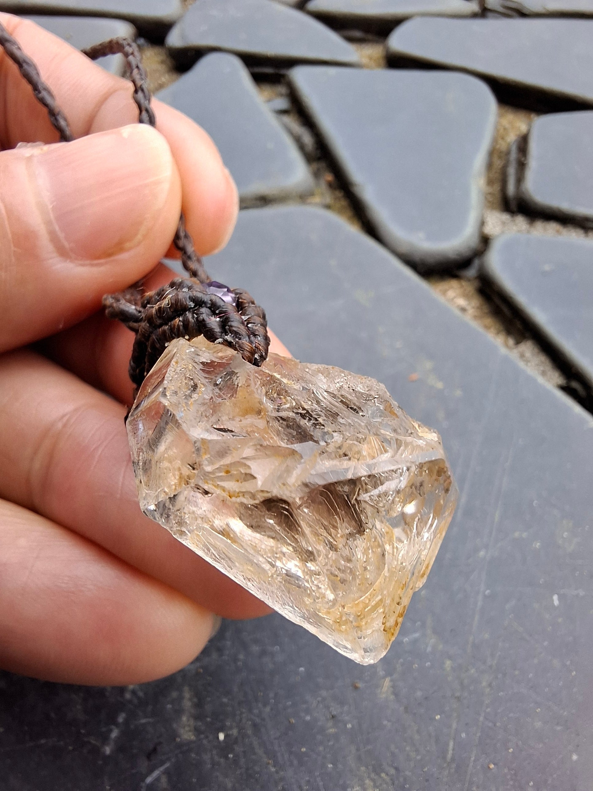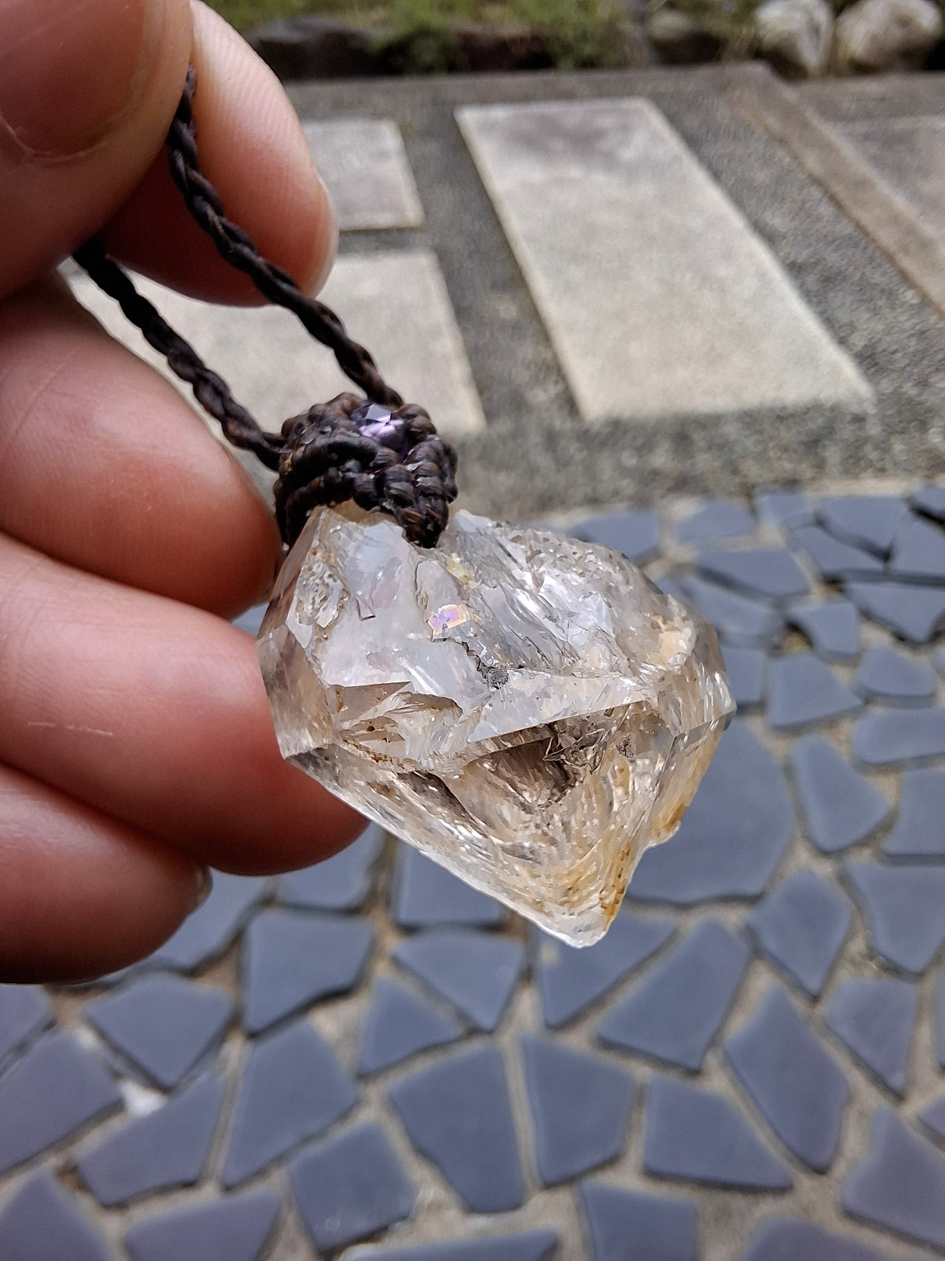 太古の石油が入った骸骨水晶で作ったマクラメ編みのペンダントです。